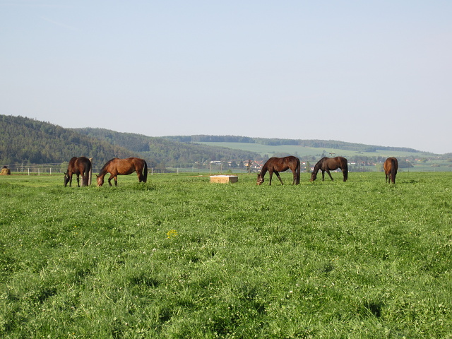 Stád je na statku několik, během léta se pohybují na obrovských pastvinách a jakmile je tráva fuč, přesunou se na pastvinu další. :) Eli tak během pastvení sezóny papá výhradně čerstvou trávu a k dispozici mají non-stop vodu a přístřešek pro úkryt. V zimě mají naopak přístup k celým balíkům sena (které si statek suší sám) a 1x za den (večer) dostávají v přístřešku příkrm z nadrceného ječmene, lněného semínka a ovesného šrotu. Pokud se potřebuje někdo z koňáků domluvit individuálně, není problém. Na statek pravidelně dojíždí kopytář i veterinářka, součástí jsou taky boxy v případě léčení úrazu či nemoci koně. A o tom, jak krásné je okolí pro vyjížďky se rozepisovat nebudu, protože by z toho byl hotový román :) Eli je spokojená a to je pro mě základ :)