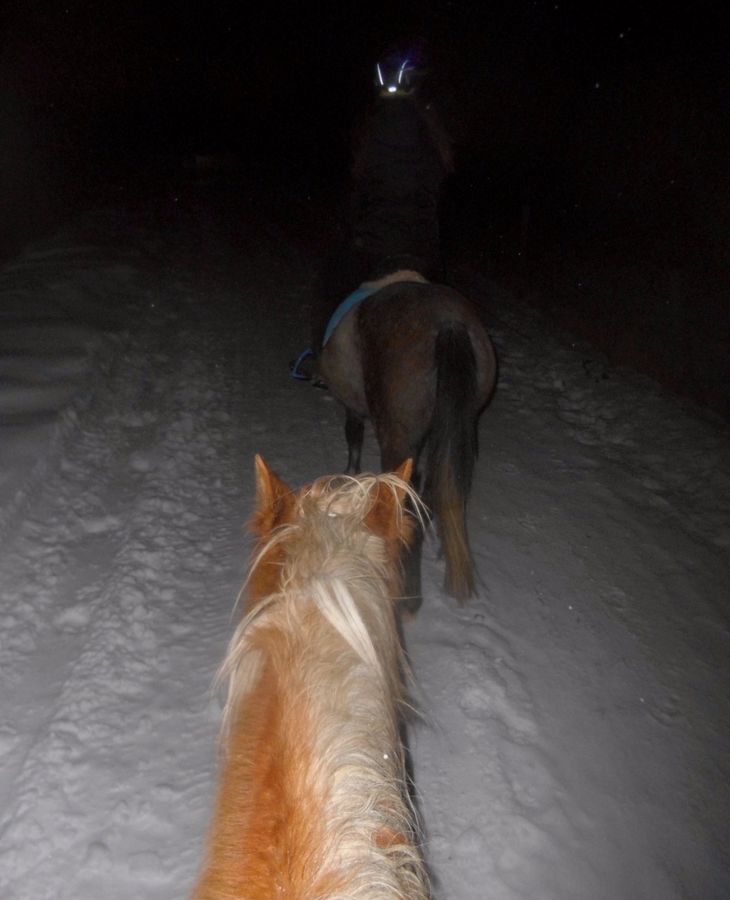 V lednu jsme si s Eli otestovaly taky první jízdu za tmy s čelovkou. Společnost nám dělal Rolf se svým poníkem Orim a Eliška s valáškem Siriusem. Byla jsem určitě daleko víc nervní než Eli, ten večer navíc poměrně dost foukalo a sem tam poletovaly nějaké ty vločky. Já - napnutá jak gatě v průvanu a Eli? 100% flegmouš... :)) Jsem ráda, že se ve stáji našli lidi, kteří nemají problém jít do podobné vyjížďky se mnou. A vůbec, že tam jsou přátelé, kteří si na nic nehrají, můžu se s nimi poradit, svěřit se jim a všechno to dohromady tam vytváří moc fajn prostředí.